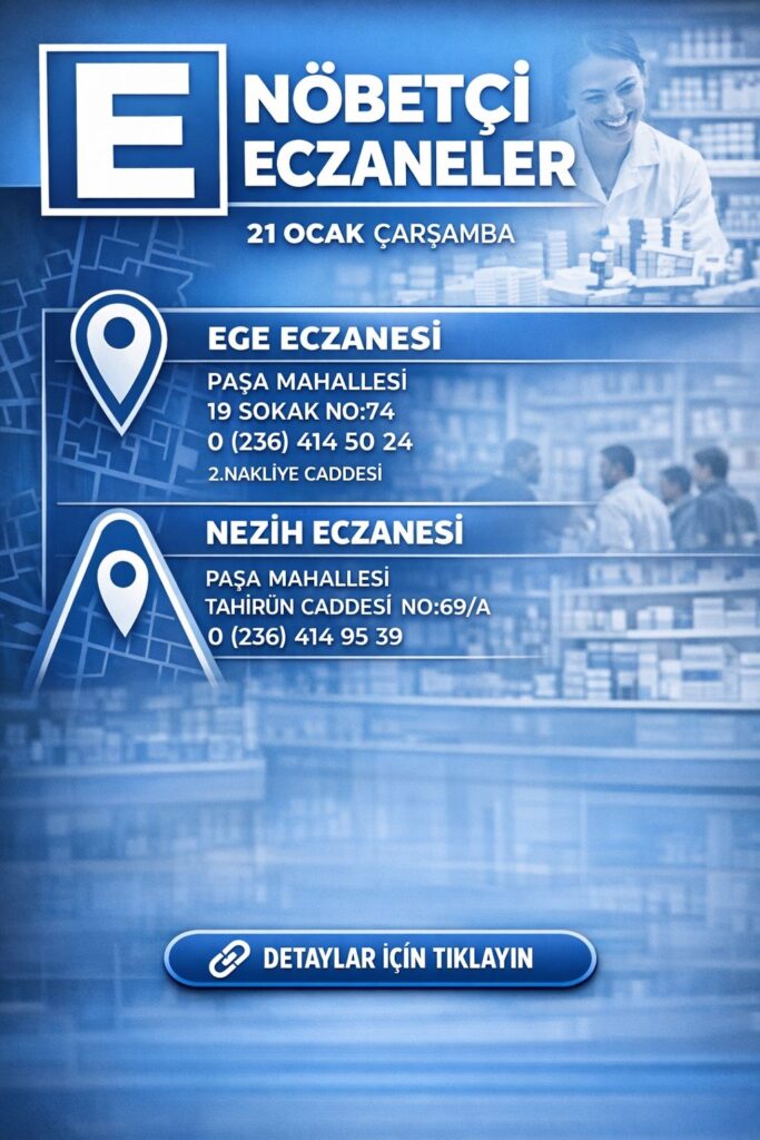 Akhisar’da 21 Ocak Çarşamba günü vatandaşların ilaç ihtiyaçlarını karşılayacak nöbetçi eczaneler açıklandı. İlçede Paşa Mahallesi’nde bulunan iki eczane gece boyunca hizmet verecek.